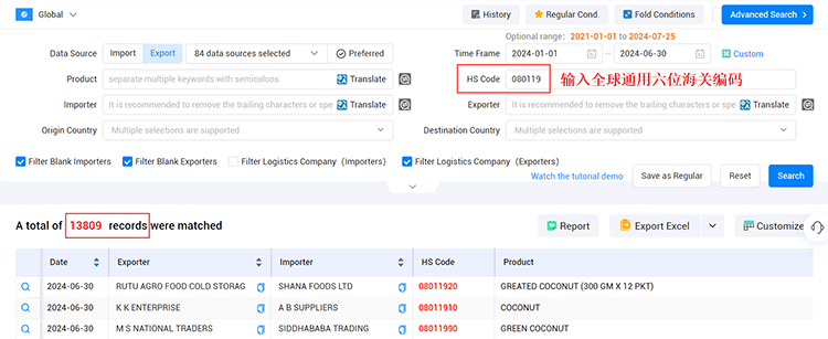 在豪门国际海关数据查询平台中,输入准确的HS Code。如果你不确定要开发的国家,可以使用前6位海关编码进行搜索。前6位编码在全球范围内统一,可以帮助你找到更多的潜在客户。
